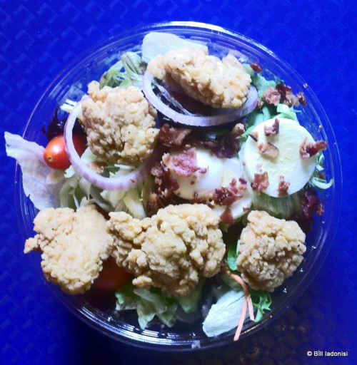 The seafood platters are a Fried Shrimp ($9.89) affair with coleslaw and French Fries, and Fried Fish Basket ($7.49), served with apples or French Fries. For the turf portion, we have fried chicken nuggets ($7.89) — a nice sized portion with 8 pieces, again served with choice of apples or French Fries. A BLT salad ($7.69) consists of fried breaded chicken nuggets (4) over a bed of Mixed Greens, bacon, egg and tomato. You can also order a Garden Harvest Salad ($8.19), mixed greens, chicken, garden vegetables, sunflower Seeds and cheese. And my favorite, Chicken breast nuggets and Fried fish, again with choice of apples or French Fries.