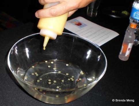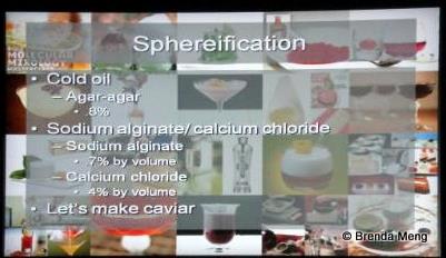We did get to “play” a bit during this part of the seminar: at each place setting there was a squeeze bottle with orange-colored gel and a bowl of liquid chemical specific to the sphereification process. Guests were instructed to slowly drip the gel into the bowl where each drop would turn into a little caviar bubble that we could add to a drink we would each be allowed to make at the end of the class.