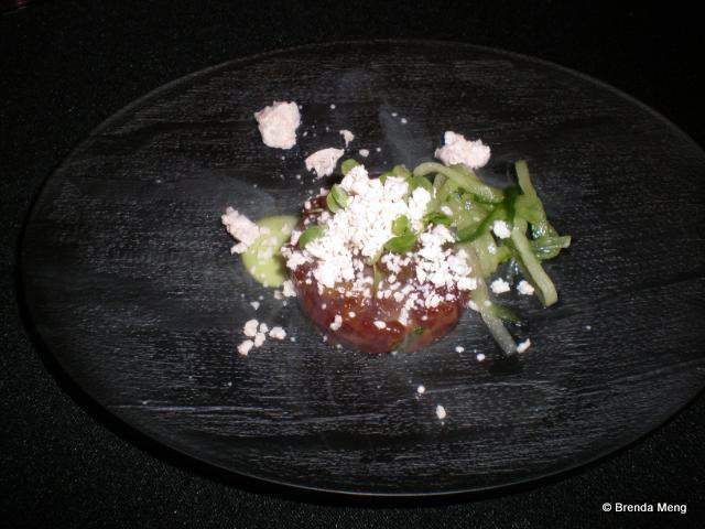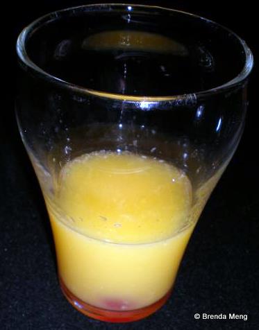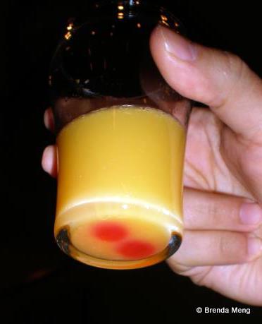 The second cocktail we were presented with was a Tequila Sunset, which was an example of sphereification, or the caviar bubble-making process. The drink itself was a whole lot of tequila with some orange juice, while the sphereification was represented by two bright red, gelatinous grenadine balls floating near the bottom of the glass. This drink really didn’t do much for me –- it wasn’t mixed very well and the caviar bubbles didn’t have much taste; they looked kind of cool, but at the end of the day I want to drink my booze, not chew it.