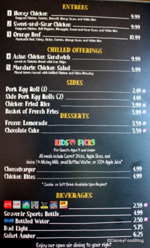 The Asian fusion menu includes savory-sweet favorites like Sweet-and-Sour Chicken and Orange Beef. A Mandarin chicken salad and Asian chicken sandwich are included in the entrees, and a fun list of sides (pork egg rolls!!) and desserts rounds out the menu. Entrees here run around $9-$10 (pricey for counter service), but you can make a great meal out of the side dishes — many of which you can get for a Disney Dining Plan snack credit.