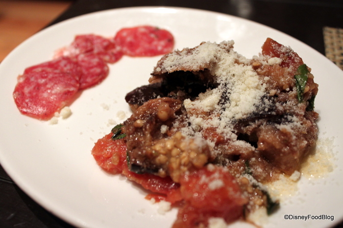 Specializing in Italian cuisine from the Abruzzi region of Italy, the menu covers the basics — pastas, meat dishes, pizzas, risottos, and more. While browsing the menu, we were treated to a small appetizer — an eggplant dish with salami — compliments of the Chef. After leaving the restaurant and speaking about it with friends, I’ve heard that this particular amuse bouche is a huge winner for most guests! We also were given two types of bread, of which one was an olive oily focaccia sprinkled with chili flakes — absolutely incredible! I couldn’t stop eating the stuff…