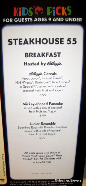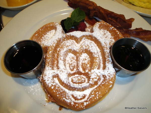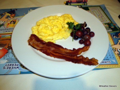 As far as the kids menu goes, it is limited, but does not disappoint. Children can choose from a variety of cereals (which I don’t recommend you waste your money on — they are those teeny tiny boxes and cost $6.99), Mickey-shaped pancake, or the Junior Scramble. Each kids meal comes with fresh fruit, yogurt and a drink.