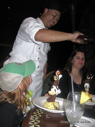 The talented Chef TJ pours warm chocolate over this gluten-free tower of brownies, pineapple, and bananas at ‘Ohana. Photographer: Mary Jane 43