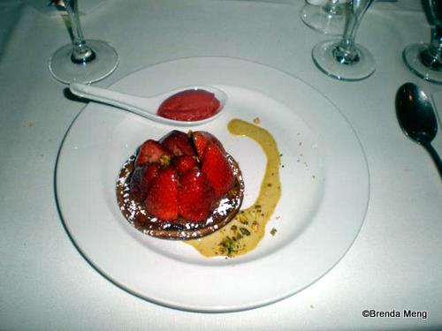 Dessert, which I’ve always considered a French art form, consisted of a Strawberry Tart and a Strawberry Sorbet served with a 2007 Muscat Beaumes De Venise. The strawberries were lovely and flavorful, but this was the first time in my culinary life that anyone has tried to pass off a pancake as a tart. There was no pastry with this dish, only some Bisquick and maybe a little buckwheat; it was a definite letdown, especially because we know from experience that Bistro turns out some amazing desserts on a nightly basis.