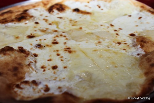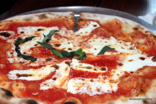 Now, let’s get down to some serious deliciousness! Folks have been bemoaning the lack of decent pizza in Walt Disney World for years, and when Via Napoli was announced — with its focus on wood-fired, thin-crust pizzas — hope sprung eternal. Today, I am grateful to say — on behalf of Disney food fans everywhere — that our day has come! The pizza here is exquisite, and while it doesn’t quite rival my favorite shops in NYC, it is delicious in its own right.