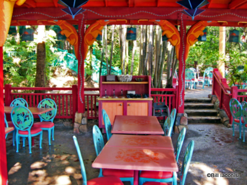 The only negative is that on very warm and muggy days, even with the trees and covered pavilions, some may find it uncomfortable for dining. So if you are looking for a respite from the heat, you might want to go to Pizzafari or Dinoland’s Restaurantosaurus.