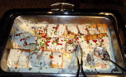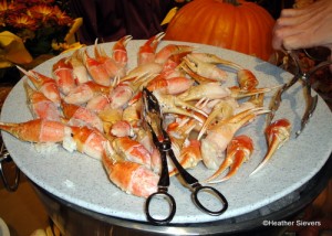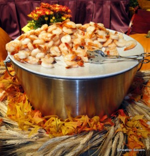 Other items at the table were smoked and cured meats; pickled vegetables; a build your own Caesar salad bar; an Autumn harvest salad bar; orzo pasta salad with roasted vegetable ratatouille basil vinaigrette (a little over the top for me — odd flavor); and sweet potato & yam salad with golden raisins, sweet onions and cinnamon dressing, which was very tasty. The cold selection buffet also featured piles and piles of crab legs and shrimp.