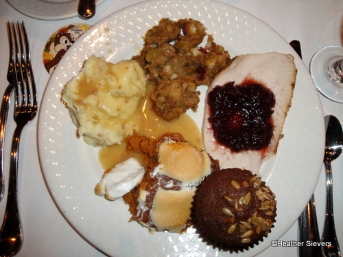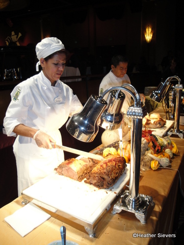 Next, on to the Main Entrees. This was the part of the buffet where you could find all of your traditional Thanksgiving foods. There were two cast members carving meats: turkey, ham & prime rib. I had the turkey, which was so moist and flavorful. I usually don’t eat much turkey on Thanksgiving; I tend to stick to the side dishes, which are my favorites. This year though, I ate my whole slice of turkey. It helped that the buffet had the most delicious cranberry orange sauce to drench it in!
