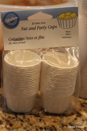 A brief online search lead me to a source for the little cups, which I now know are “Solo brand souffle portion cups.” I got mine at webrestaurantstore.com, but there may be local suppliers near you. The Solo souffle cups come in a variety of sizes. I chose to try the one ounce and two ounce versions. I also tried the Wilton brand candy and nut cups available at my local Michael’s craft store, which look nearly identical to the Solo cups, but have a shiny coating inside the cup. And we tried a traditionally-shaped mini cupcake liner.