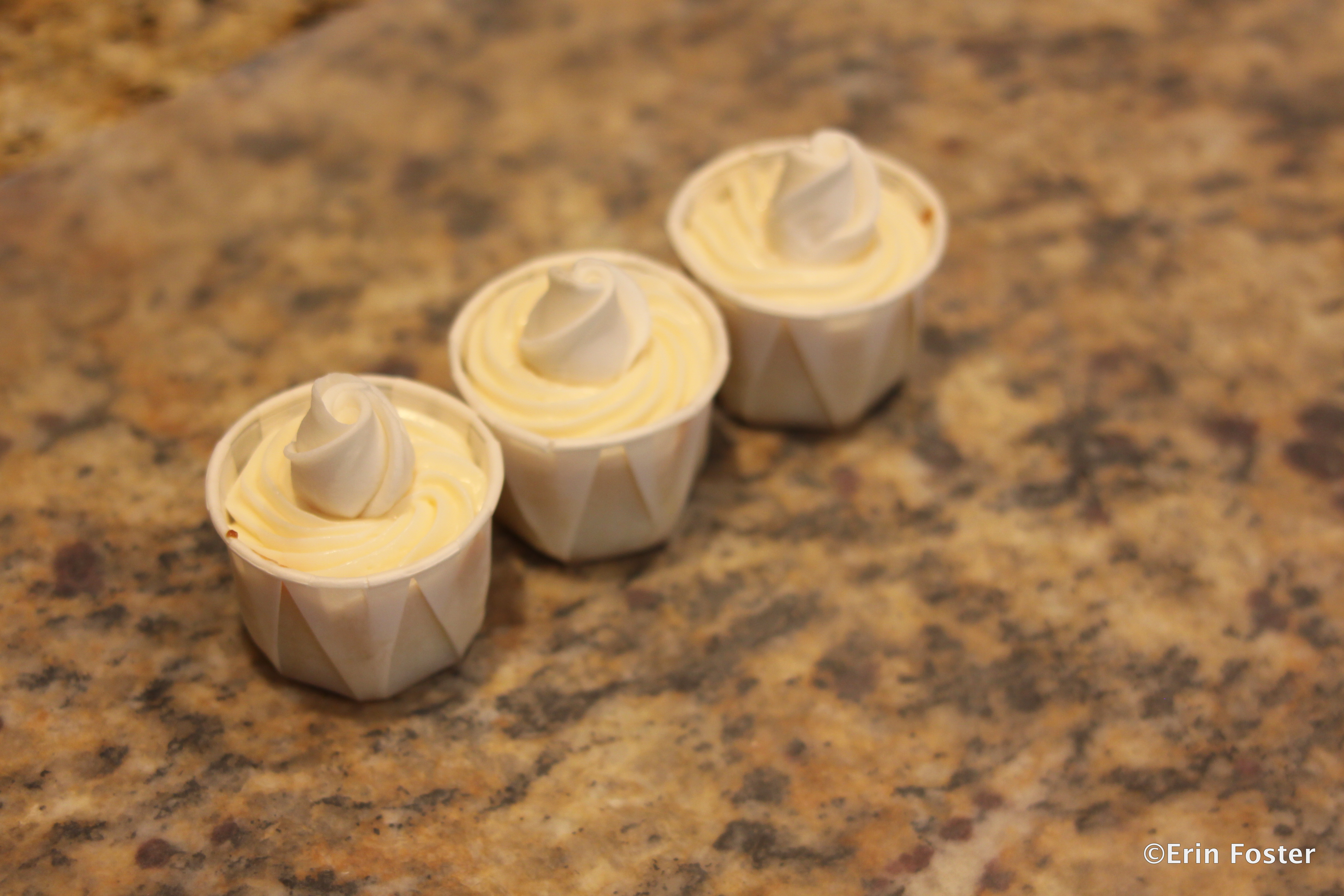 You can get a sense of just how small these little cups are by using the quarter for reference. Left to right, the cups are the traditional liner, the one ounce Solo cup, the Wilton nut cup, and the two ounce Solo cup. They are all perfect for little one to two bite morsels.