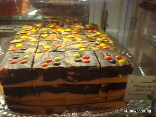 Located in many of Disney World’s candy shops during the Halloween and Thanksgiving seasons is this bi-colored, chocolate-peanut-butter Reese’s Pieces fudge!
