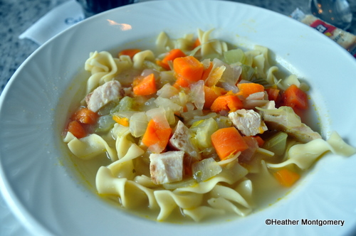 It did not take long for our appetizers to arrive piping hot to our table. I ordered the chicken noodle soup, and my husband ordered the crab cakes.