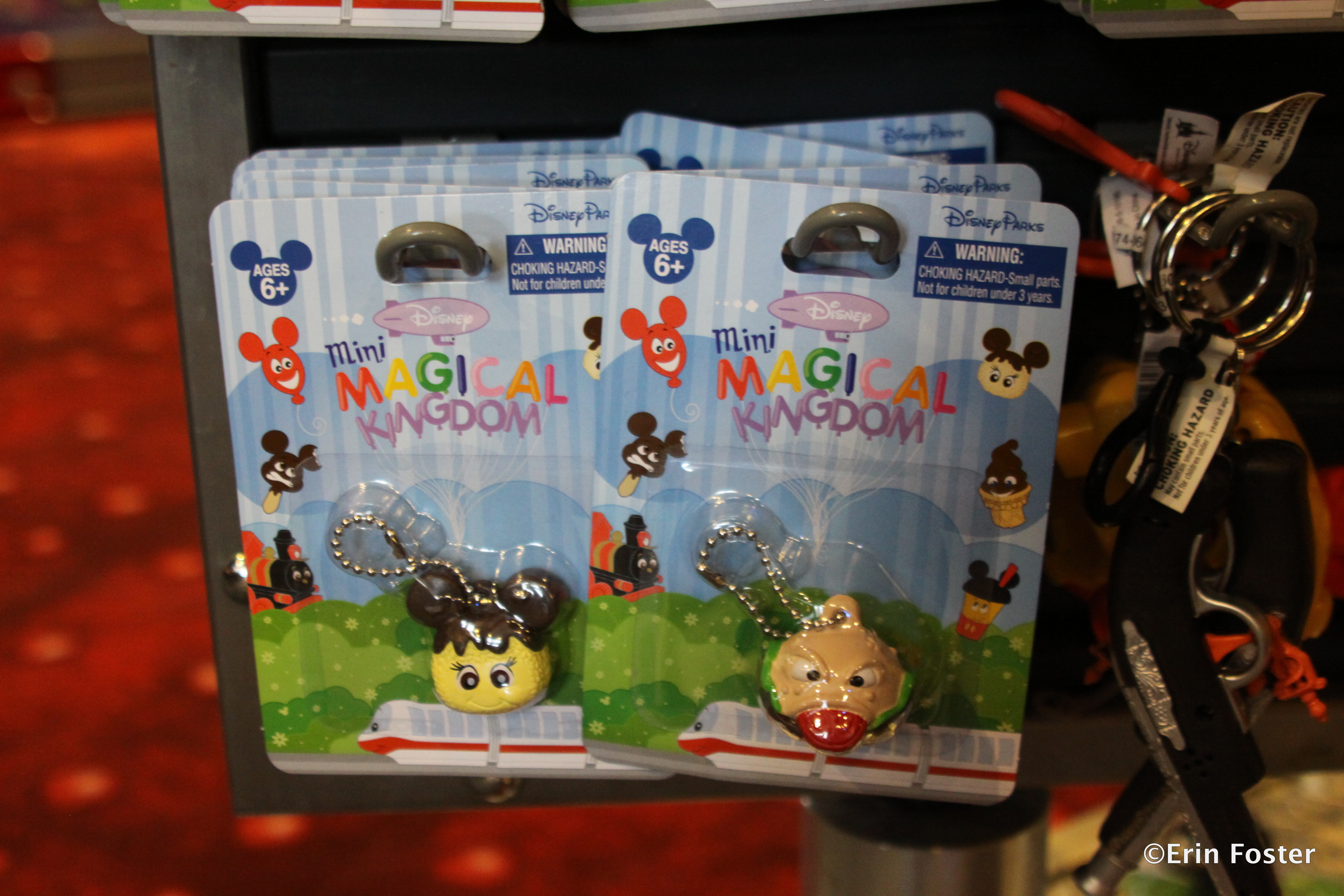 While exploring in Epcot’s Mouse Gear, I happened upon these cute/creepy keychain/erasers from a series of merchandise called Mini Magical Kingdom. Several of the items appear to be anthropomorphized versions of classic Disney food items. I love the smiling monorail on the packaging – so very friendly.