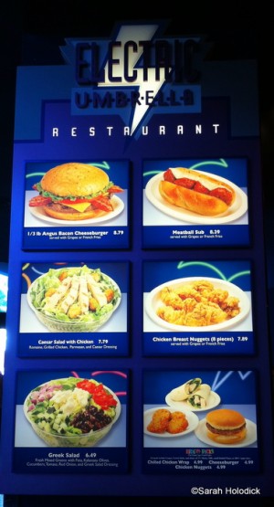 Future World isn’t exactly known for its restaurants, and Electric Umbrella probably wouldn’t be in many people’s “Top 5 Restaurants in WDW.” The only reason I bothered to stop in was because it was there and convenient (and I hadn’t eaten there in over 15 years). I needed to get over to Wonders of Life, and I didn’t feel like trekking over to The Land. I figured I could at least grab chicken nuggets and fries, because I know better than to order a burger. The menu was your standard burgers, chicken nuggets, salads, meatball sub… Wait, meatball sub, eh? I bit.