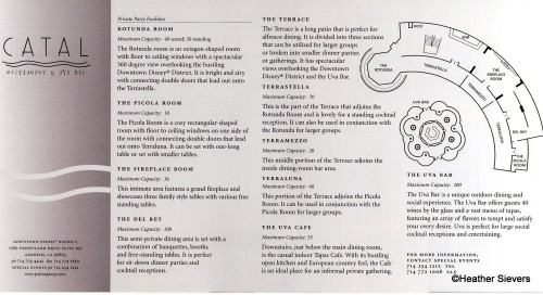Catal is located smack in the middle of Downtown Disney, Anaheim. It is a bi-level restaurant that features a smaller dining room and kitchen downstairs (the Uva Café) and a very large upstairs with multiple dining rooms, some of which can be sectioned off and rented for special occasions (Catal). The main kitchen is also located upstairs. The layout can be seen below.