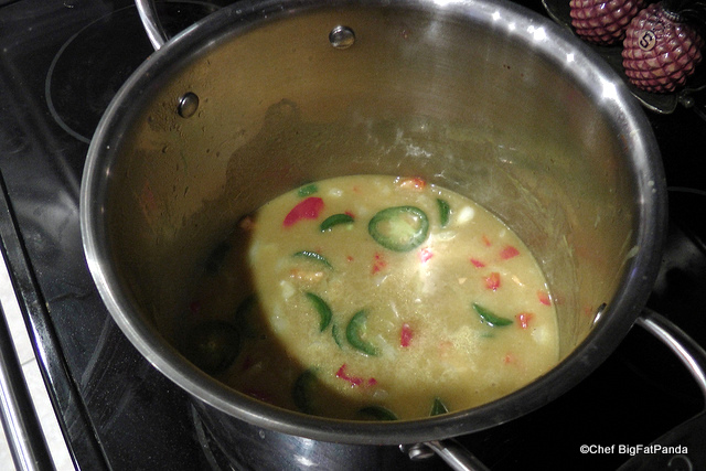 3. Heat chicken stock, curry powder, coconut milk and roux. Let simmer until thickened.