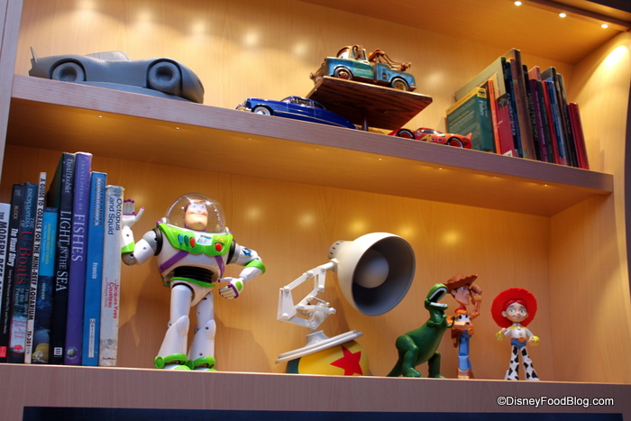The dining room on the Dream looks like an animator’s office, filled with books, character models, sketches, and cels from your favorite Disney/Pixar movies.