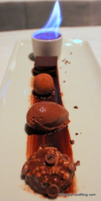 Over in the Epcot Resort Area, bluezoo offers an all-chocolate all the time dessert called the Chocolate Melange. As part of this decadent set of mini-desserts, you’ll get a milk chocolate malt creme brulee that comes to the table in flames!