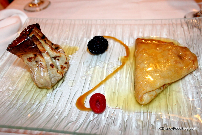 On our visit, we ordered the Duo de Crepes — one Suzette and one apple. The Suzette was flambeed table-side and caused quite a stir!