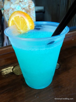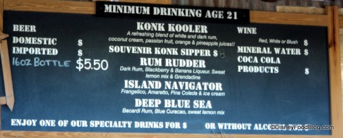 On the menu are drinks and more drinks — the famous Castaway Cay Konk Kooler made with rum, coconut, pineapple and orange juices, and passion fruit; the Island Navigator with Frangelico, Amaretto, Pina Colada, and ice cream; and more. While the drinks here tend toward the sweet, there are a couple for those of us who tend toward the sour 😉