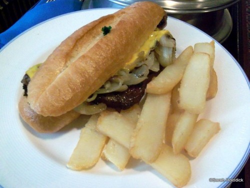 Steak Sandwich – on sourdough with mushrooms, onions and American cheese. Served with French fries.: