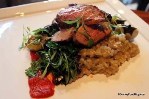 The Flank Steak Flatbread was phenomenal. Folks, I’ve had it twice now, and it is very probably my favorite appetizer on Disney World property. Hunks of savory flank steak, sweet caramelized onion, the crunch of arugula, rich manchengo cheese, and a Berbere sour cream — which has a base of red chiles — on top. Heavenly. Kudos to the chef for coming up with this one. It makes the barbecue chicken flatbread pale in comparison.
