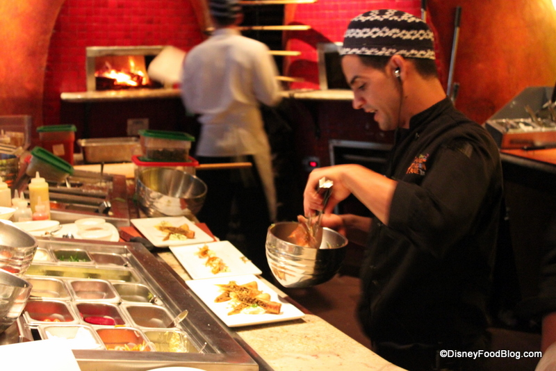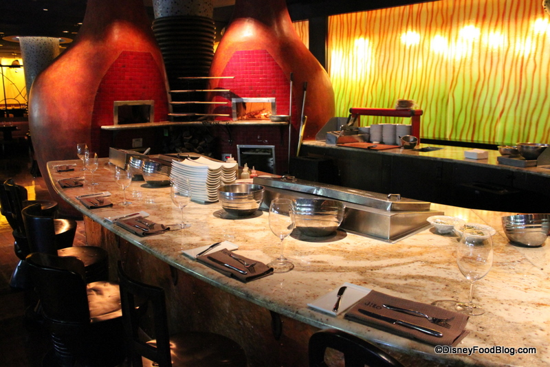Walking further into the restaurant your eye could be drawn in several directions. The large open kitchen — or Jiko (which means “the cooking place”) — to your right features huge wood burning ovens in a gorgeous shade of orange. Follow the chimneys up to see one of the biggest hidden Mickeys on property! It’s fun for kids (and adults!) to watch the sous chefs work their magic on the appetizers at the counter…