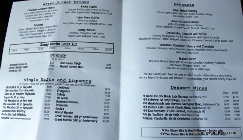 As an aside, Jiko has always been my refuge from the “potato-rut” that Disney restaurants have gotten themselves into. It seems that nearly every main entree has to feature some sort of potato side dish these days, and that just doesn’t have to be the case. There are gorgeous pastas, risottos, rice, cous cous, vegetable dishes, and other strong contenders that can be used in place of the fingerling, au gratin, or baked potato dishes, and I hope to see more of these infiltrate Disney menus in the future. Granted, Jiko’s sporting four potato side dishes in its entree list in the January menu — up from two in October — but I’m chalking that up to a winter menu… . 😉