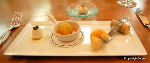 And since this is the best dining experience I’ve ever had, I suppose I should talk about the food. Our first course consisted of quail egg with Galilee caviar, buffalo mozzarella, smoked salmon panna cotta with salmon caviar, and popcorn crusted gulf shrimp. I wasn’t a huge fan of the salmon caviar, but that’s totally subjective. The quail egg was wonderful, not overpowering in taste, and incredibly creamy. The mozzarella and shrimp were familiar flavors that were enhanced by the quality of the food we were served.