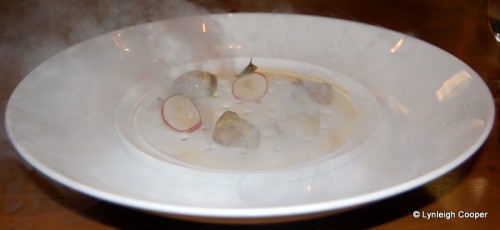 The third course was another favorite of mine, Niman Ranch lamb with Fuji apple and curry dressing. The presentation of this course is pretty awesome. They bring the plate out and place it in front of you, and then hot cider is poured over small holes in the plate, which activates the dry ice underneath causing smoke to rise up. The lamb was the best I had ever had, and the sweet flavor from the apples enhanced the flavors of the lamb.