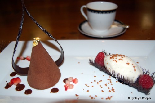 Next came the first of our two dessert courses; green apple mousse between hazelnut cookies and sour cream ice cream. Considering I was looking forward to the chocolate dessert that Chef Hunnel promised us at the beginning of the meal, I admittedly didn’t pay much attention to this one. It was a little too tart for my tastes, but my cousin and uncle really enjoyed it.
