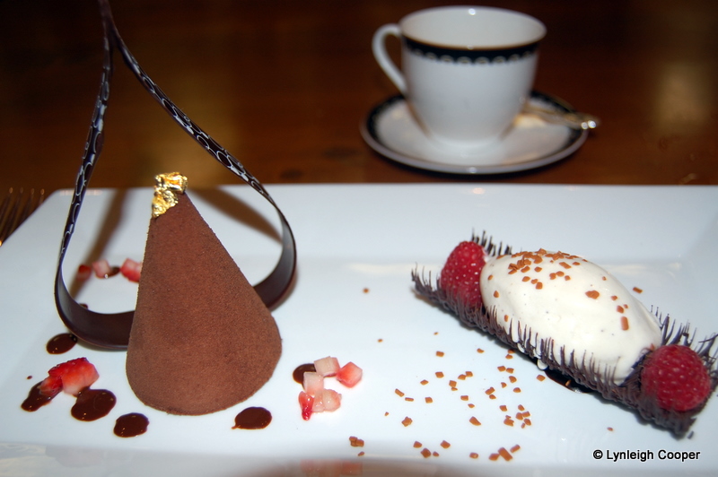 The last course of our meal was pretty spectacular. We were served Tanzanie chocolate mousse and white chocolate gelato. The former was actually topped with edible gold. The white chocolate gelato was divine, and the whole plate was the perfect ending to the meal. At the end of the meal, the entire kitchen staff came back and posed for photos with us. We were also given the customary rose and candies, and were told to take as much time as we wanted to take any pictures we desired.