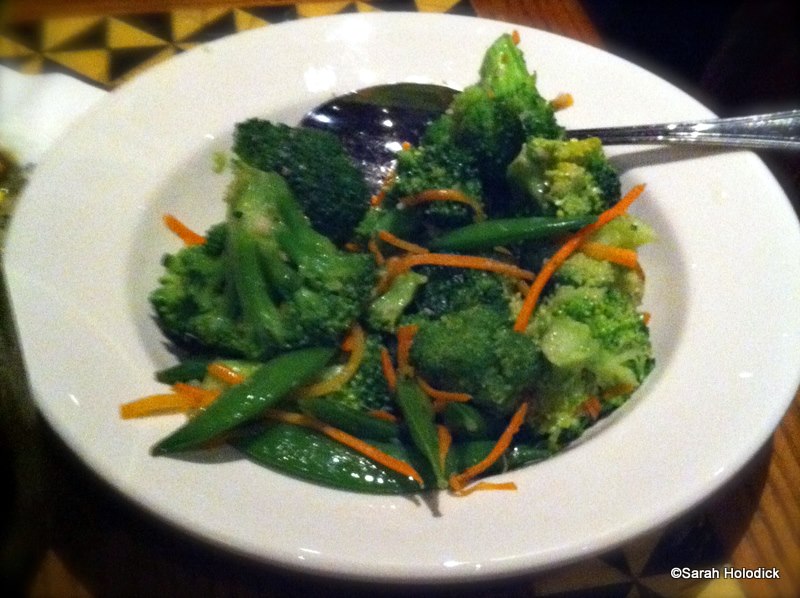 We ate some of the snow peas out of the vegetable mixture and I thought they were cooked just right. The trio of sauces we were given were peanut, mustard, and sweet and sour. I personally didn’t use any of the sauces, although I did taste them and thought they all tasted good. The peanut sauce was thinner than we expected, and Matt didn’t expect it to drip off the fork like it did. He still thought it was awesome, though he would have preferred it to be thicker.