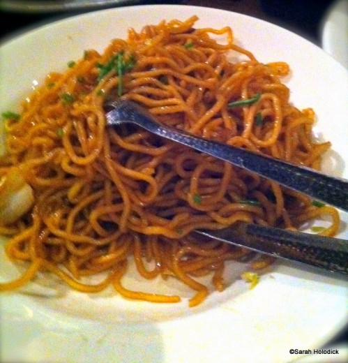 We then received Lo Mein noodles, vegetables and a trio of dipping sauces for the forthcoming skewered meats. The noodles were pretty standard and tasted fine, but I didn’t have more than a forkful. Matt enjoyed them, and said they were better than the alternatively greasy stuff from take-out.