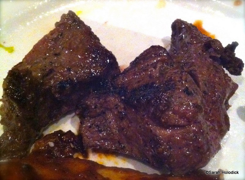 Next came what we thought would be the star of the show, the skewers! We were served Marinated Sirloin Steak, Spicy Grilled Peel and Eat Shrimp, Asian Barbecued Pork Loin, and Oak Grilled Chicken. Matt and I agreed that the steak was our top choice of the four proteins served. It was actually cooked rare! Look at the picture!