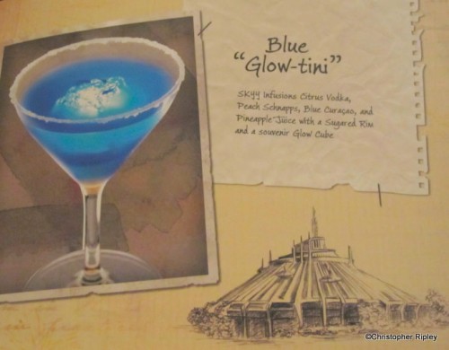 The Blue Glow-tini can be found around WDW in various bars and is a mixture of citrus vodka, peach schnapps, blue curacao and pineapple juice. It is served with a sugared rim and a souvenir glow cube.