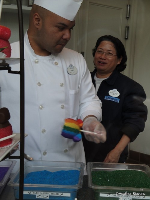 Right after the “dip,” he begins working his magic. Starting with the red sanding sugar, Tony works his way through a rainbow of sugars: red, orange, yellow, green, blue & purple.