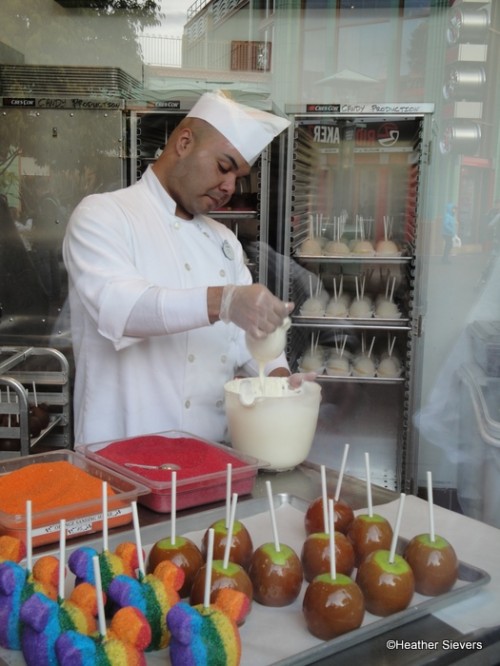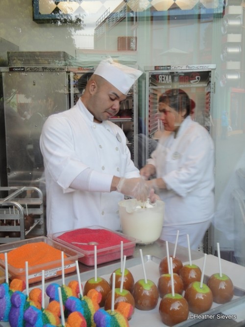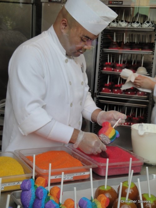If you read my posts regularly, you know I am a sucker for Marceline’s in Downtown Disney. That giant candy kitchen window is my favorite thing to check when I go to the parks. You never know what they will be making. I’ve seen everything from cupcakes to chocolate dipped strawberries, and just about every type of Disney caramel apple they make. Yet, I had never seen them making the World of Color apples until just this past week. And, until I did, I had no idea what an art form making one of these little beauties was.