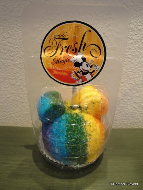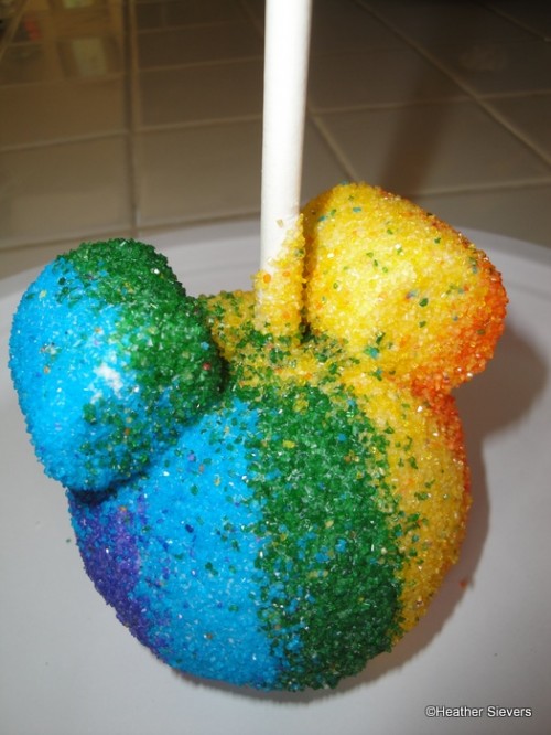 They may not be rainbow, but Goofy’s at Downtown Disney in Orlando has a variety of lots of premade fresh caramel apples. They are excellent and the last one we had was coated in all kinds of different chocolate stuff. They add different kinds of toppings, too. We never try to eat it there, either. We take it with us and cut it up later to share!