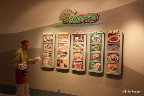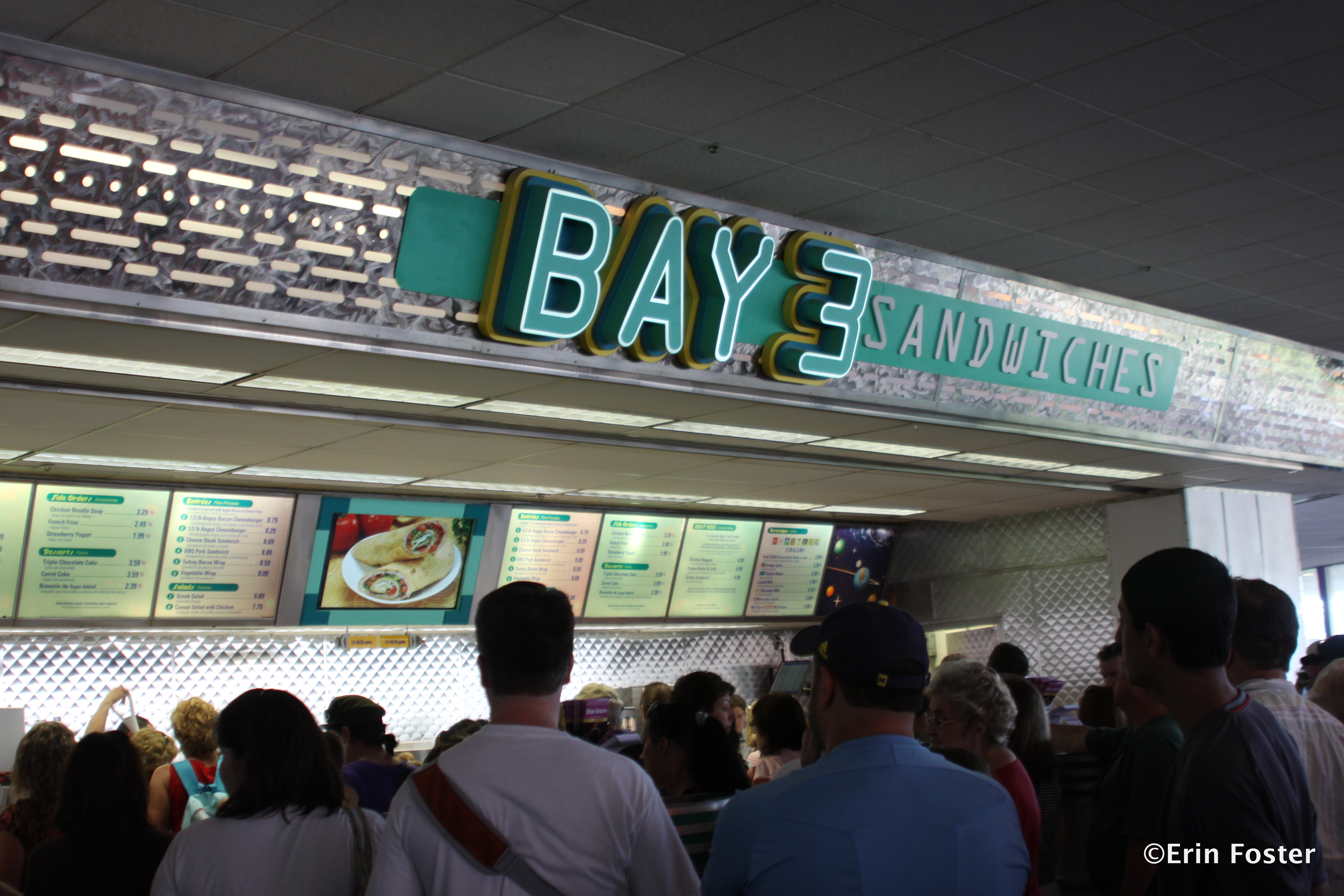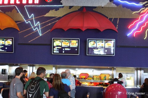 For those of you new to eating at WDW, some of the quick service (otherwise known as counter service) restaurants are set up with one order/payment line for all types of food items served there. The out-of-Disney-World analogy to this would be McDonald’s or similar fast food restaurants where you walk up to the cashier and tell him you want a burger, your husband wants chicken, and your daughter wants a salad. You pay and they give you all your food on one tray. Makes sense, right?