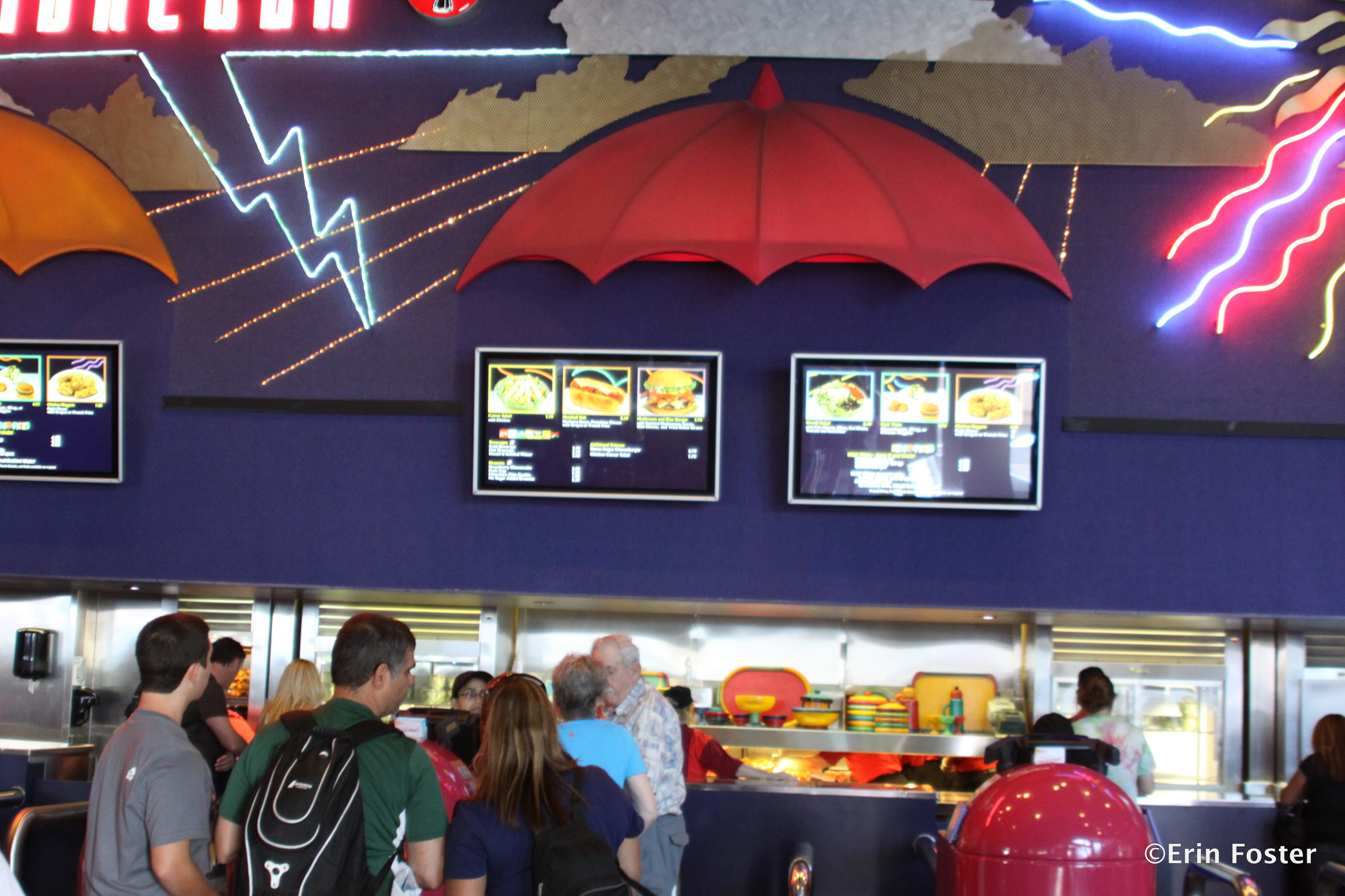 However, many quick service restaurants on Disney property do not follow this model. Instead of one place to order all the items sold at that location, there are multiple lines. One line to order burgers, one line to order chicken, one line to order salads, and so on. The out-of-Disney-World analogy to this is the mall food court.