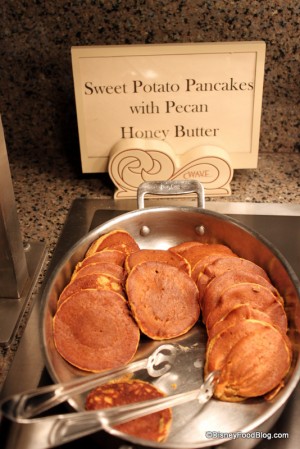 These sweet potato pancakes with pecan honey butter (the butter was located over in the cold section of the buffet) were incredible. I’m not a huge sweet potato fan, but these tasted delicious — sweet and nutty. They were like no other pancake I’ve had on a Disney buffet, and I think that’s a good overall theme for this review. The new items I sampled were unique; they were like nothing I’ve ever tried in any other Disney restaurant.