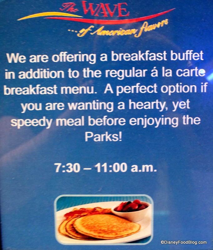 We visited the Wave breakfast buffet twice on our January trip and were very pleased. It was only temporary at that point and we took advantage of the signs indicating it was available through January. The food was delicious, and other than the steak and egg breakfast, everything on the buffet was on the menu. We loved the variety offered and the salmon, hardboiled eggs, onions and capers were a big hit. The grits were yummy and the pastries delectable. All in all, this buffet gets a big thumbs up from us. We will be visiting again in May and staying at Bay Lake Tower so our days will start with a big breakfast here. Saves on eating in the parks and fills us up for most of the day.