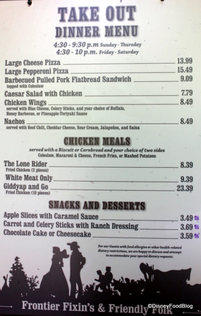And if you’re staying at Fort Wilderness or just want the magic to go, there’s a great take-out menu posted on the wall over by the take-out entrance to the restaurant. Wouldn’t it be nice to grab take-out from Trail’s End, head over to the Fort Wilderness beach, and watch the Wishes fireworks?