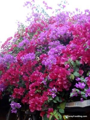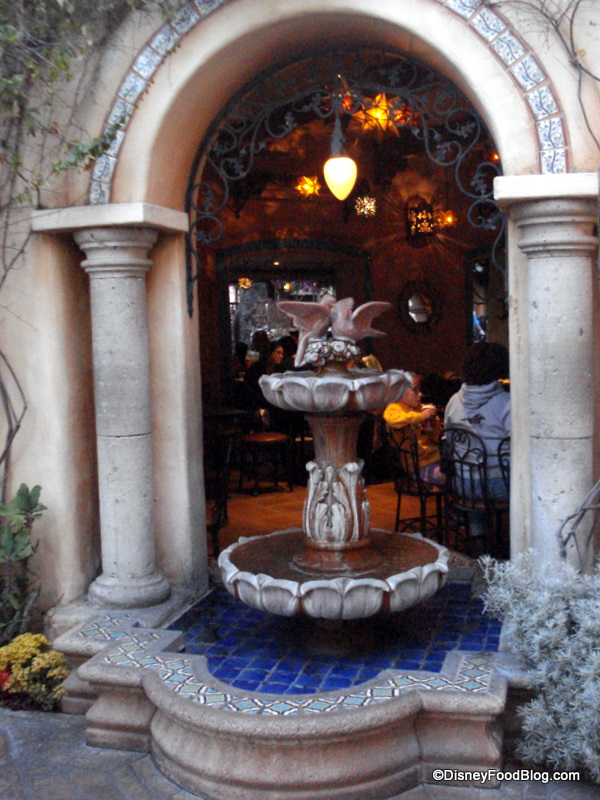 Outdoor and indoor seating is available to guests, but we prefer outdoor! It’s draped with awnings and surrounded by gorgeous flowers. Relaxing fountains trickle nearby. Even when it’s crowded, it feels a bit isolated and subdued.