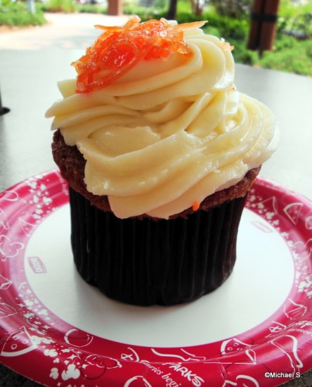 The cupcake was absolutely amazing! The frosting was definitely the best part, so sweet and creamy. It reminded me very much of the carrot cake cookie that I often get at the Writer’s Stop at Hollywood Studios, only in cupcake form. I will also add that the carrot cake itself was very moist. Overall the cupcake was extremely rich and very filling. One of the better cupcakes I have had at Disney.