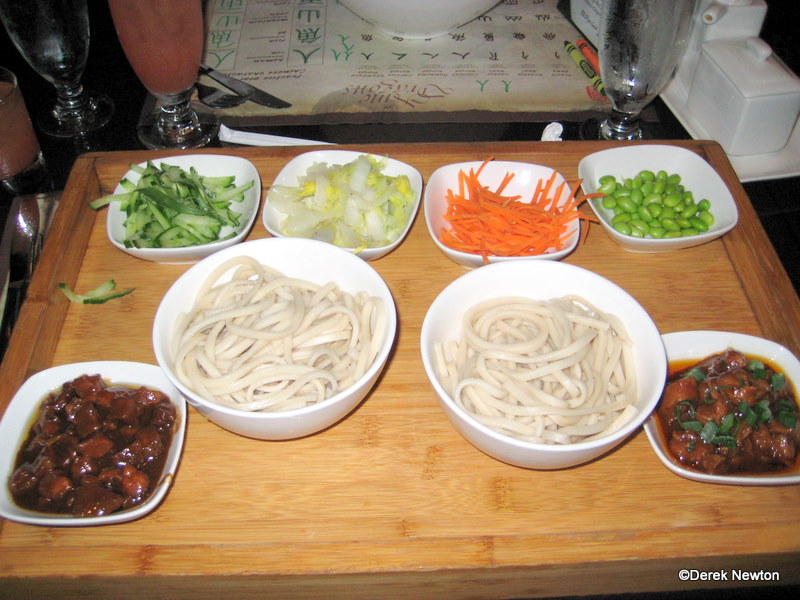 Much like the pot stickers, the pork was nearly tasteless – almost as if the recipe called for removing the taste by design. I chose the Zha Jiang Noodles Sampler because the menu said it was “fun and interactive.”