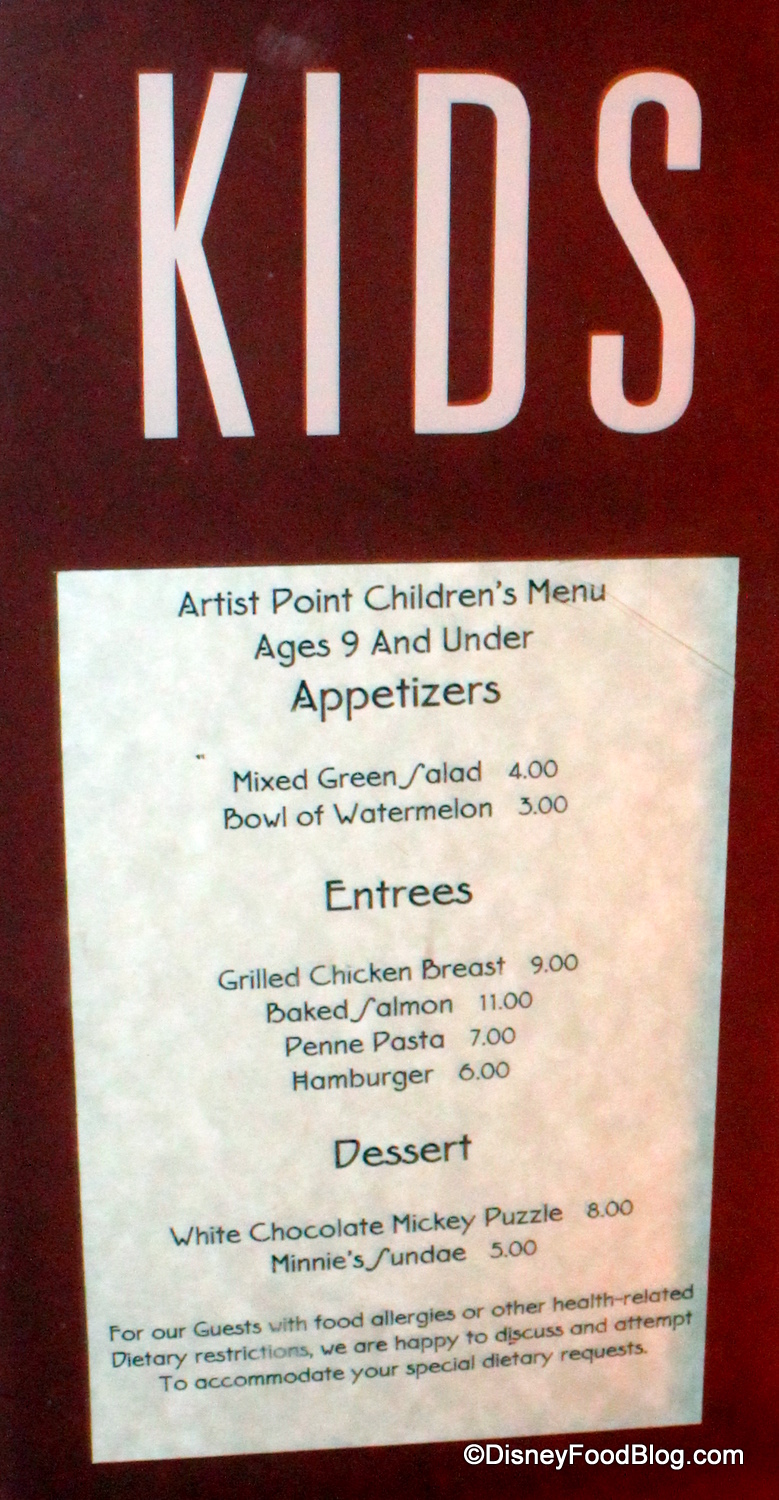 We ate at Artist Point last Friday night and loved it. I think it was one of the best meals we have ever had. The mushroom soup was out of this world. My husband had the tenderloin and I had the salmon. Both were wonderful. The tenderloin was really tender and had a great flavor. We ended the meal with the berry cobbler. We were so pleased with this restraunt. The food was really good and the service exceptional. It was a wonderful way to spend our 12th anniversary at Disney. It also helped that the Wilderness Lodge had the Cubs Den to watch our kids for us while we had a night out. All in all we can’t wait for our next trip to Disney to try Artist Point again.