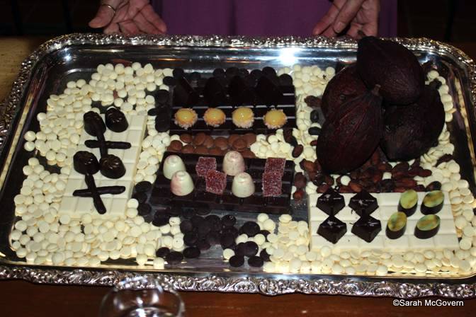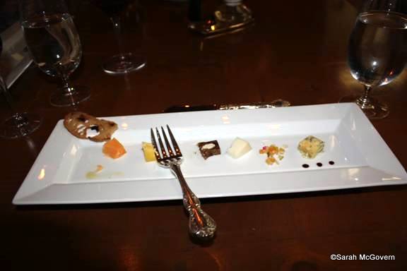 To provide this transition from savory to sweet, we were brought the cheese course – always a crowd-pleaser with my family! The progression of the four cheeses began with a mild Gouda Goat, a sharp Cheddar, a smooth Gouda Reypender, and finished with a strong Stilton. All were served with various accouterments such as a date bar, candied fruit and balsamic syrup, and a delicious Vintage Port gave each cheese a new life. A cheese course to remember!
