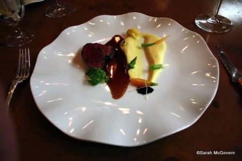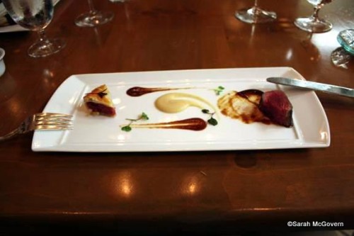 Next came the adventurous course…elk. This was a Minnesota Elk Tenderloin with a Braised Red Cabbage Tart. A bit gamier and denser in texture than beef, the elk was cooked to a perfect medium rare and was delicious. The cabbage tart was both tart and sweet and went well with the richness of the sauce for the elk. The wine for this course was a Domaine La Roquete from the Rhone region of France. I would say it is most similar to a Syrah.